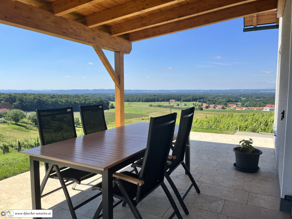 Die großzügige Terrasse mit Panoramablick über den Golfplatz bis nach Slowenien und die Koralm ist teilweise überdacht und mit dem Naturstein Travertin verlegt.